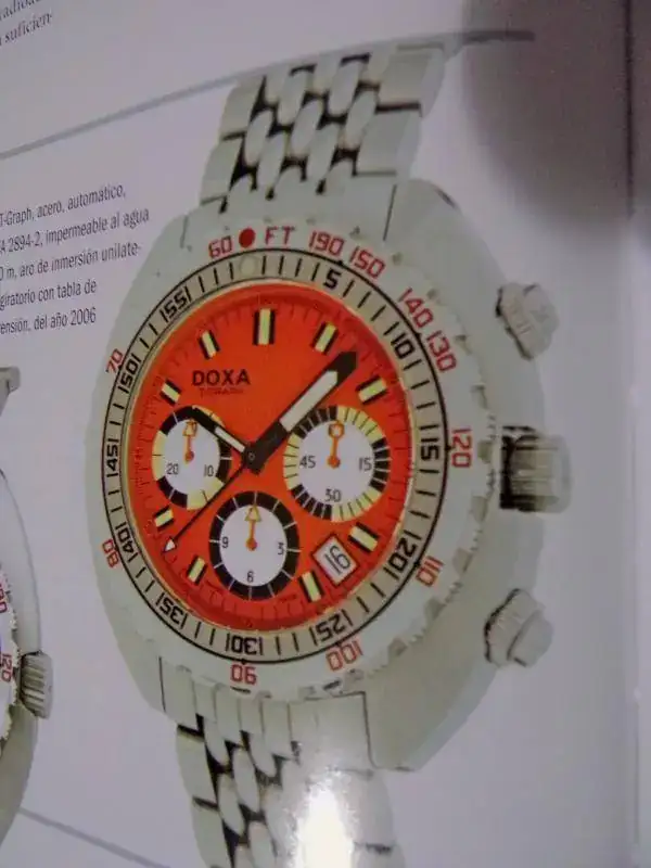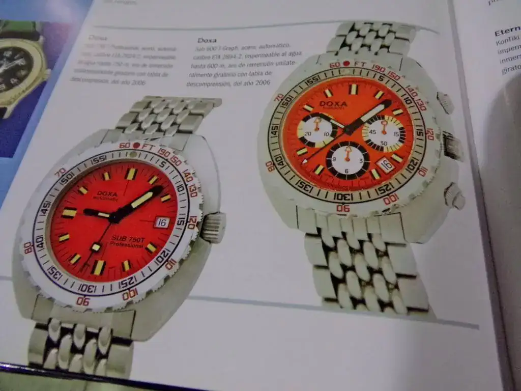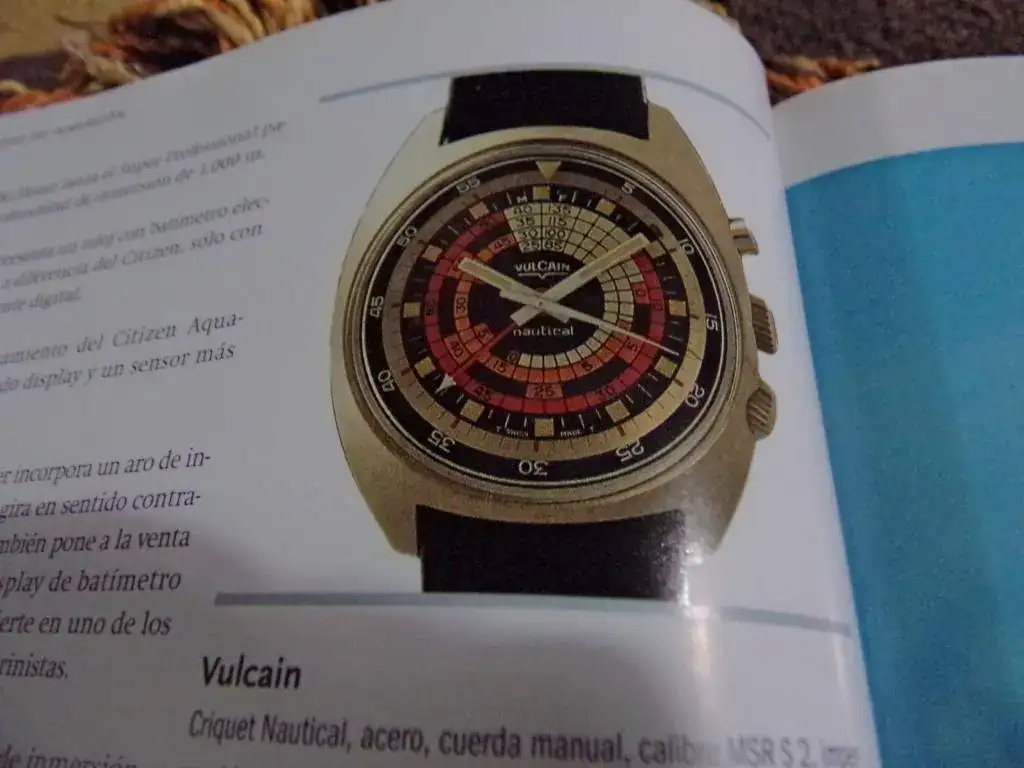 En la primera imagen hay dos Blancpain Fifty Fanthoms, uno con y el otro sin cronógrafo y bisel giratorio unidireccional de los años ´50. Este reloj fue muy popular a partir que el inmenso Jacques Costeau los empezó a usar. Luego sigue un Eterna Kontiki increíble, con caja a 90 grados para visualización; el archiconocido Omega Seamaster; dos Doxa con biseles giratorios unidireccionales y tablas de descompresión - patentadas por Doxa en 1967 -; dos Longines: el LLD con bisel giratorio interno y su primo hermano con calibre 431. Bellos ambos. Después tres piezas para el asombro: un Omega y dos Vulcain, los cuales tienen tabla de descompresión e interior con indicador de inmersión y alarma. Dos maravillas.